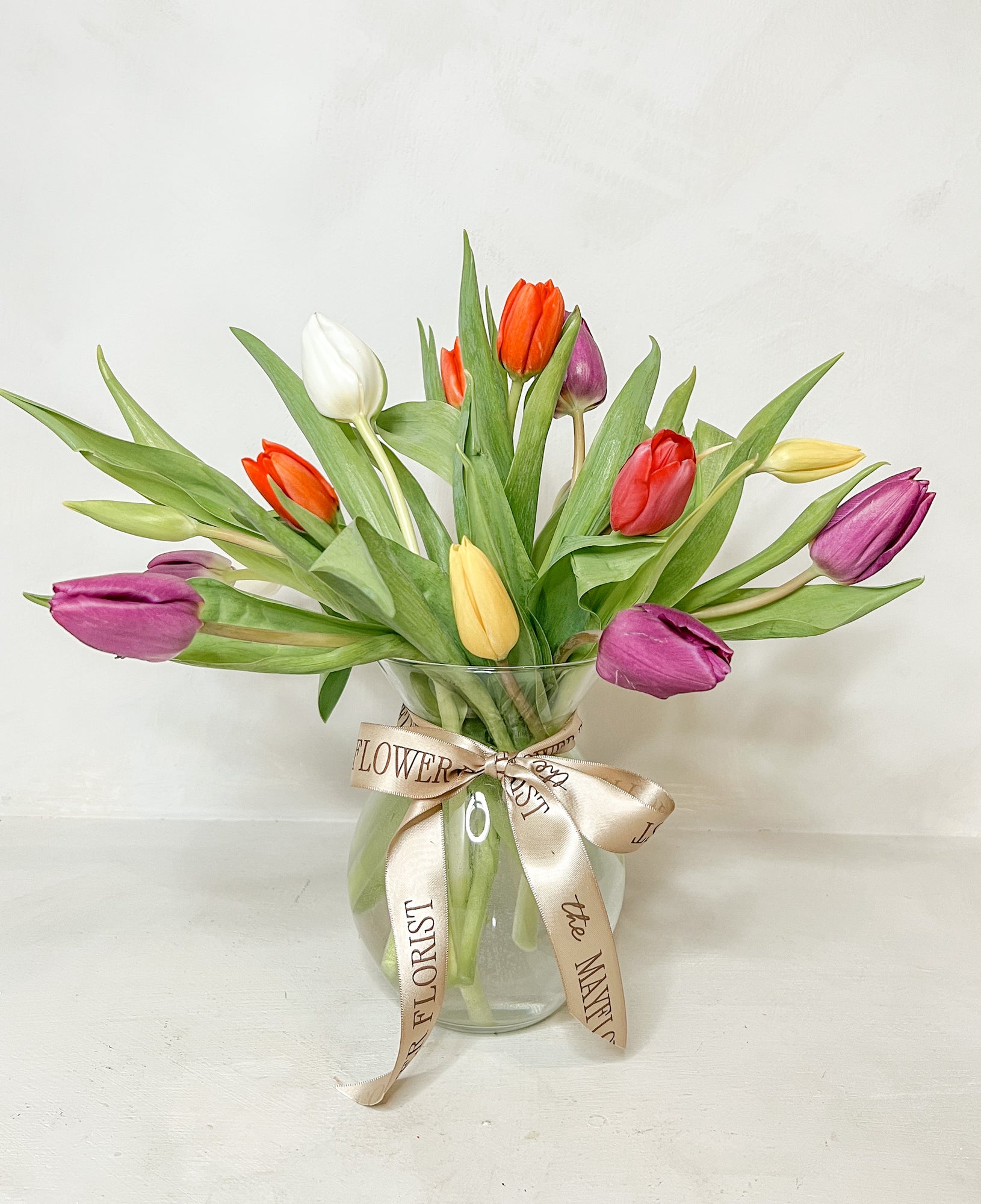 Assorted colored tulips arranged in a clear vase with "Mayflower Florist" ribbon. The arrangement is approximately 13" x 11".