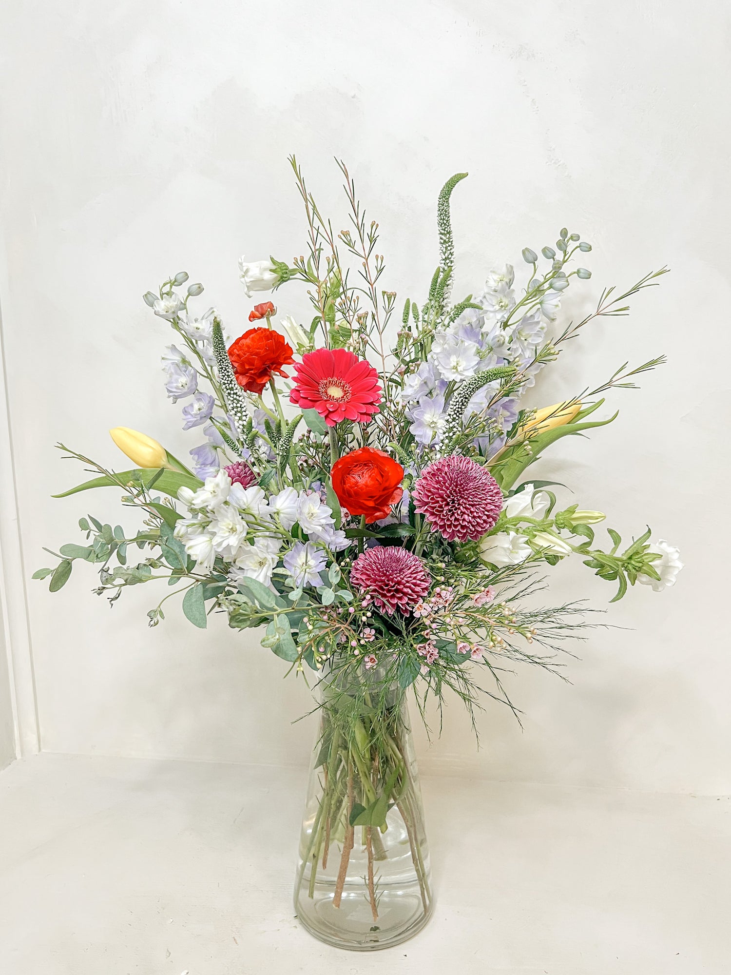 A collection of mostly wildflowers that are in stock arranged with lots of greenery and fillers, comes in a tall, clear vase. This arrangement measures approximately 24"H x 14"W.
