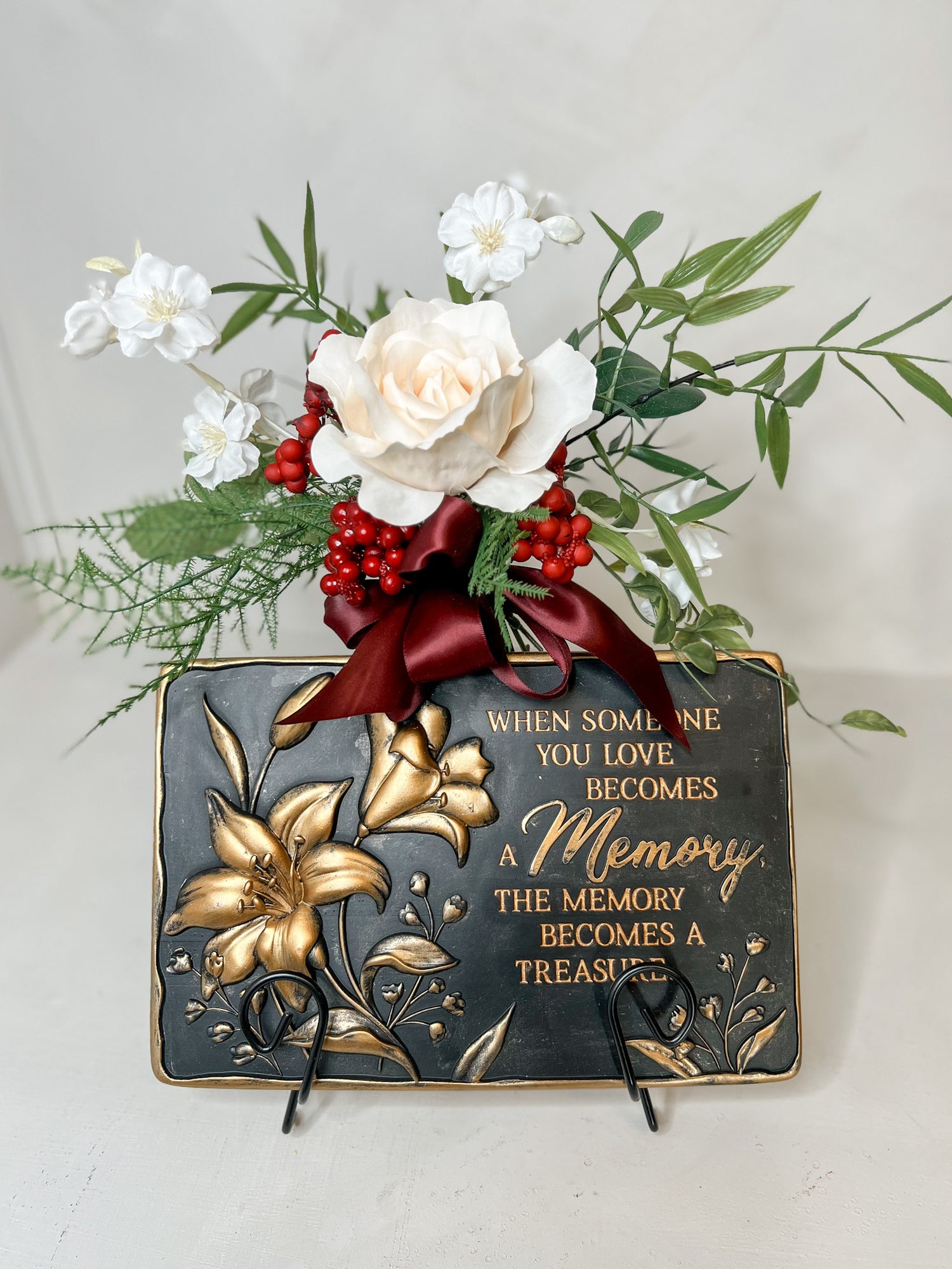 Hand painted resin stone that reads, "When someone you love becomes a memory, that memory becomes a treasure." Measures approximately 8" H x 12" W. The stone comes with a stand and artificial seasonal silk florals. Flowers will vary with availability and season.
